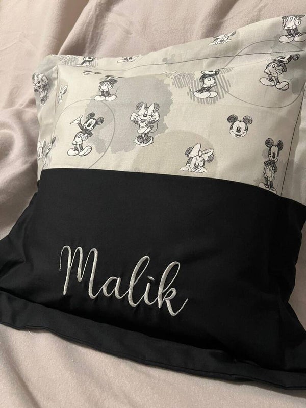 Kissenbezug mit Rand und zwei Verschiedenen Stoffen. Hierbei ist eine Bestickung (ein Name) im Preis inbegriffen.